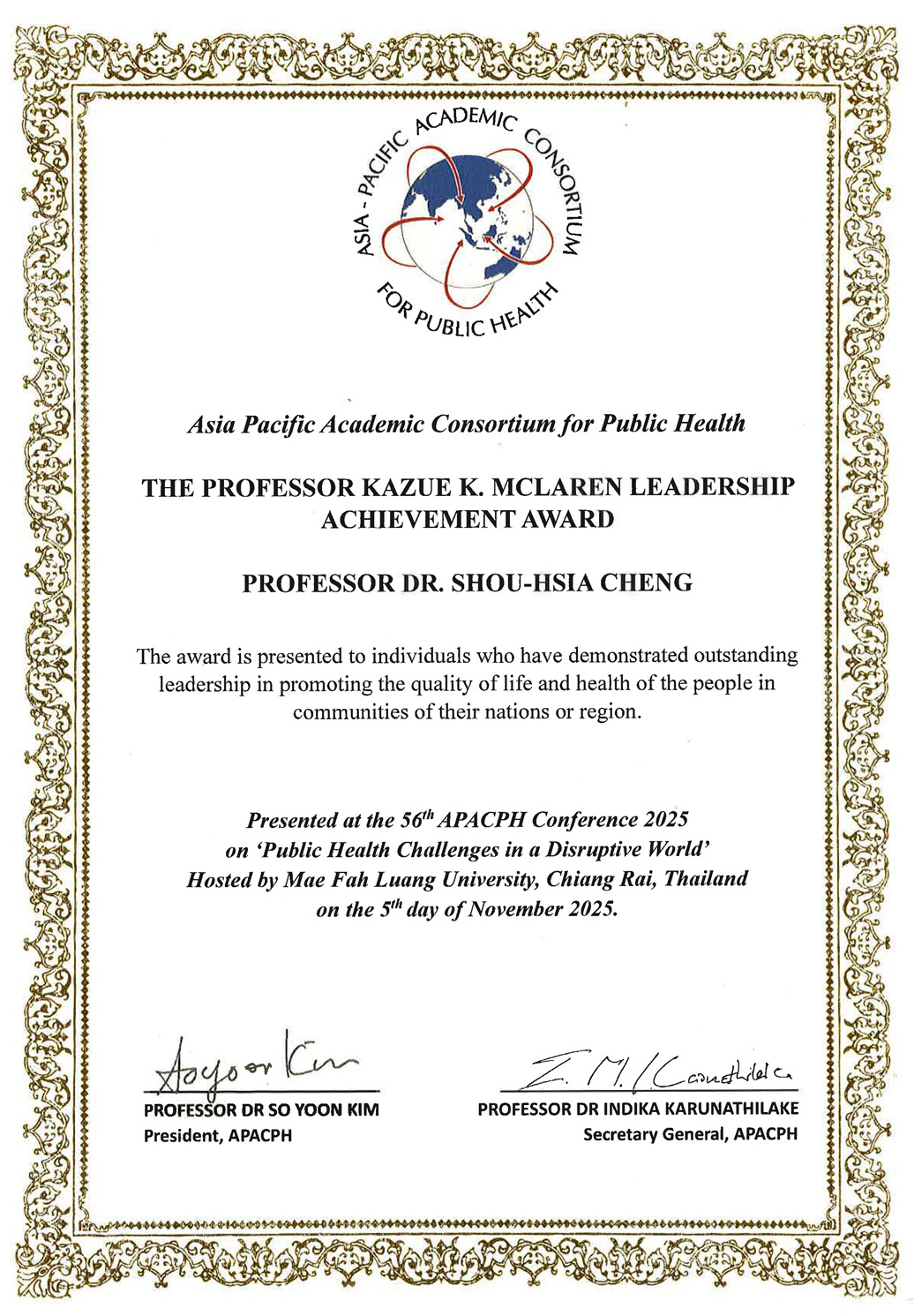 【Congratulations!】Dean Professor Shou-Hsia Cheng Receives APACPH Professor Kazue K. McLaren Leadership Achievement Award