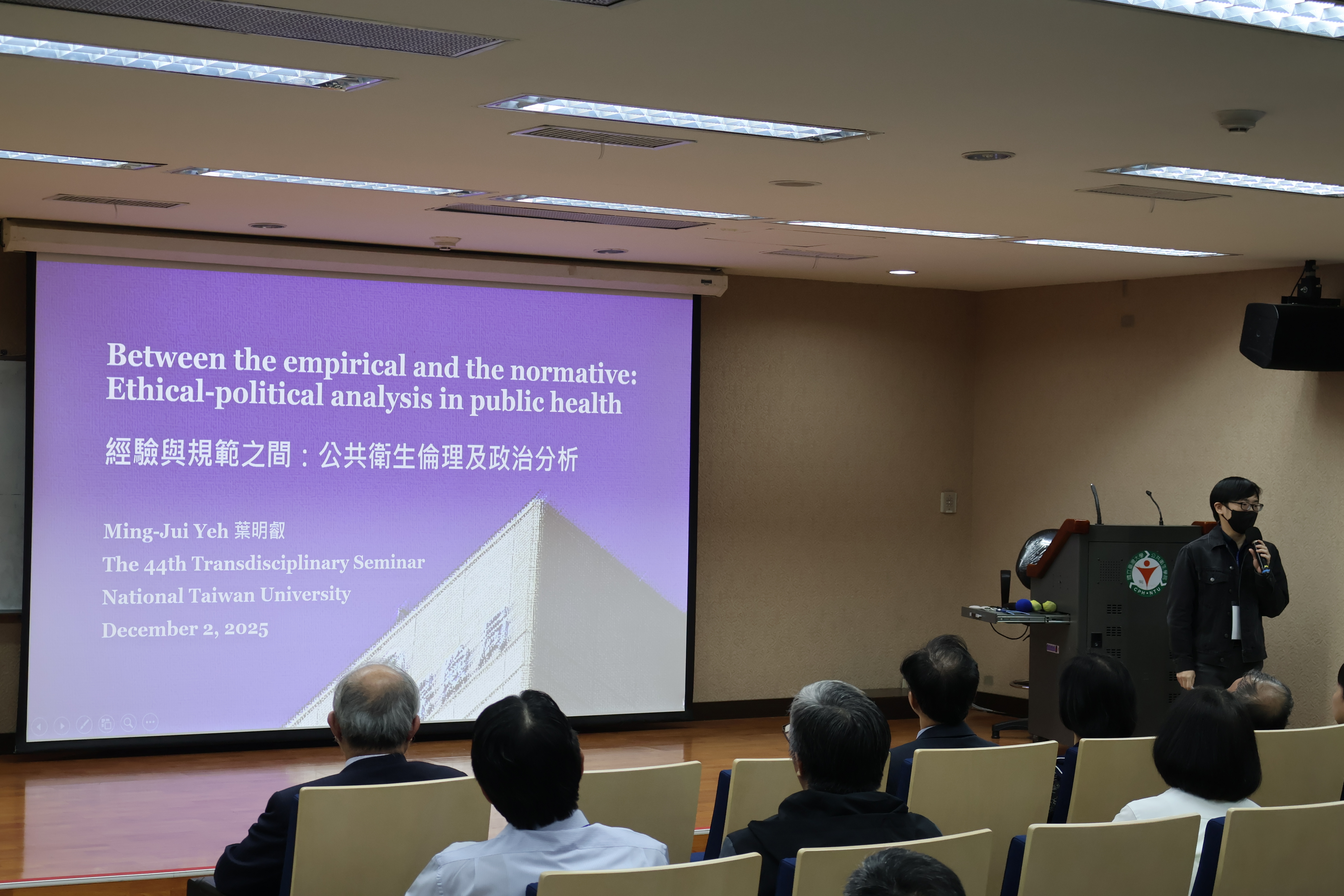 交流會由開場致詞揭開序幕,隨後進入精彩的專題演講環節。首先,葉明叡副教授以「經驗與規範之間:公共衛生倫理及政治分析」(Between the empirical and the normative: Ethical-political analysis in public health)為題,深入剖析公共衛生領域中倫理考量與政策制定之間的複雜張力,引發聽眾對於公衛決策標準的深度思辨。