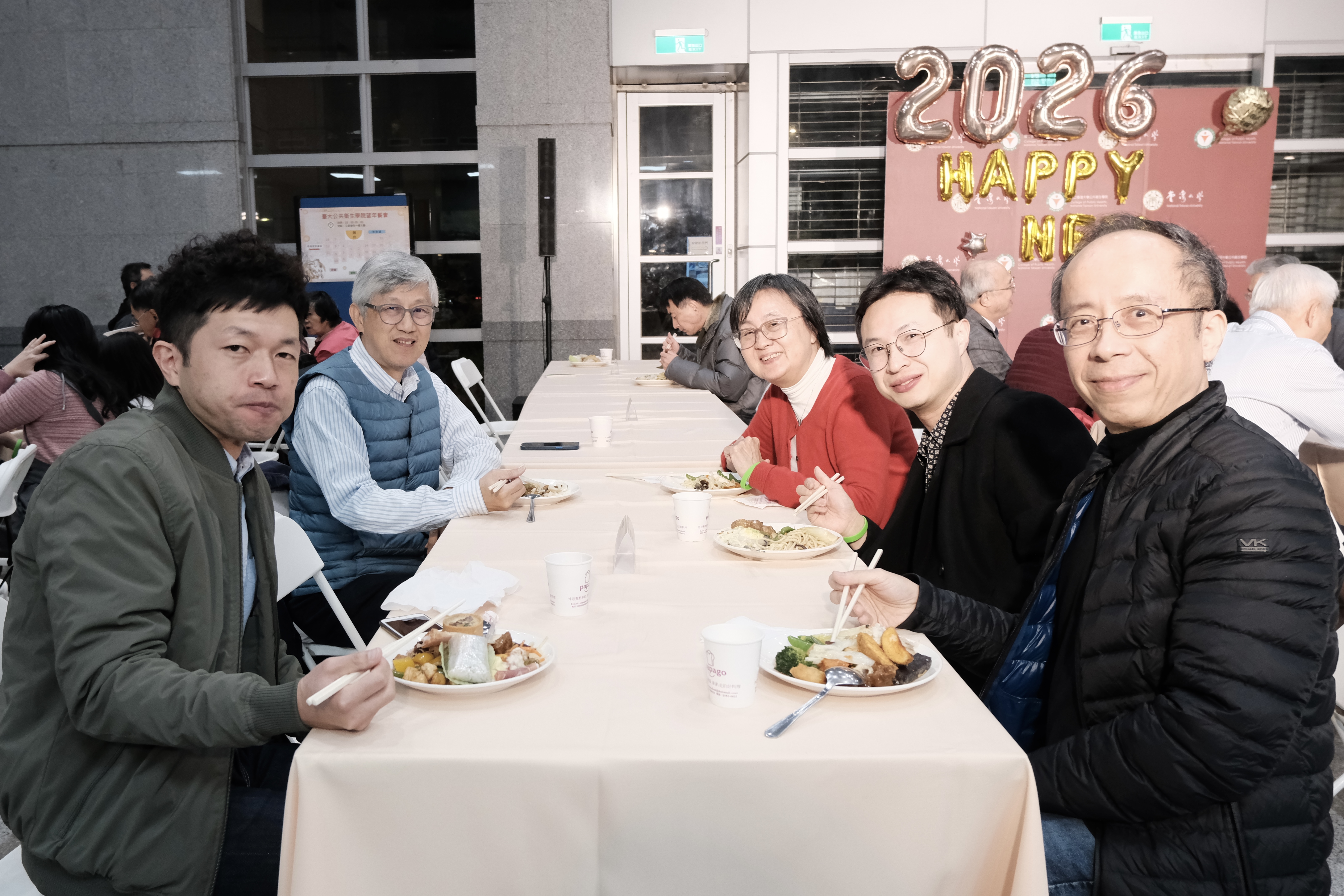 圖 餐敘氣氛和諧。 吳明賢院長(右一)、陳建仁前副總統(右二)、羅鳳萍女士(右三)、魏昇堂監事(右四)、李君浩副國際長(左三)及蘇喜教授(左一)等貴賓於席間合影,共同記錄這場師生齊聚、情誼深厚之望年盛會。